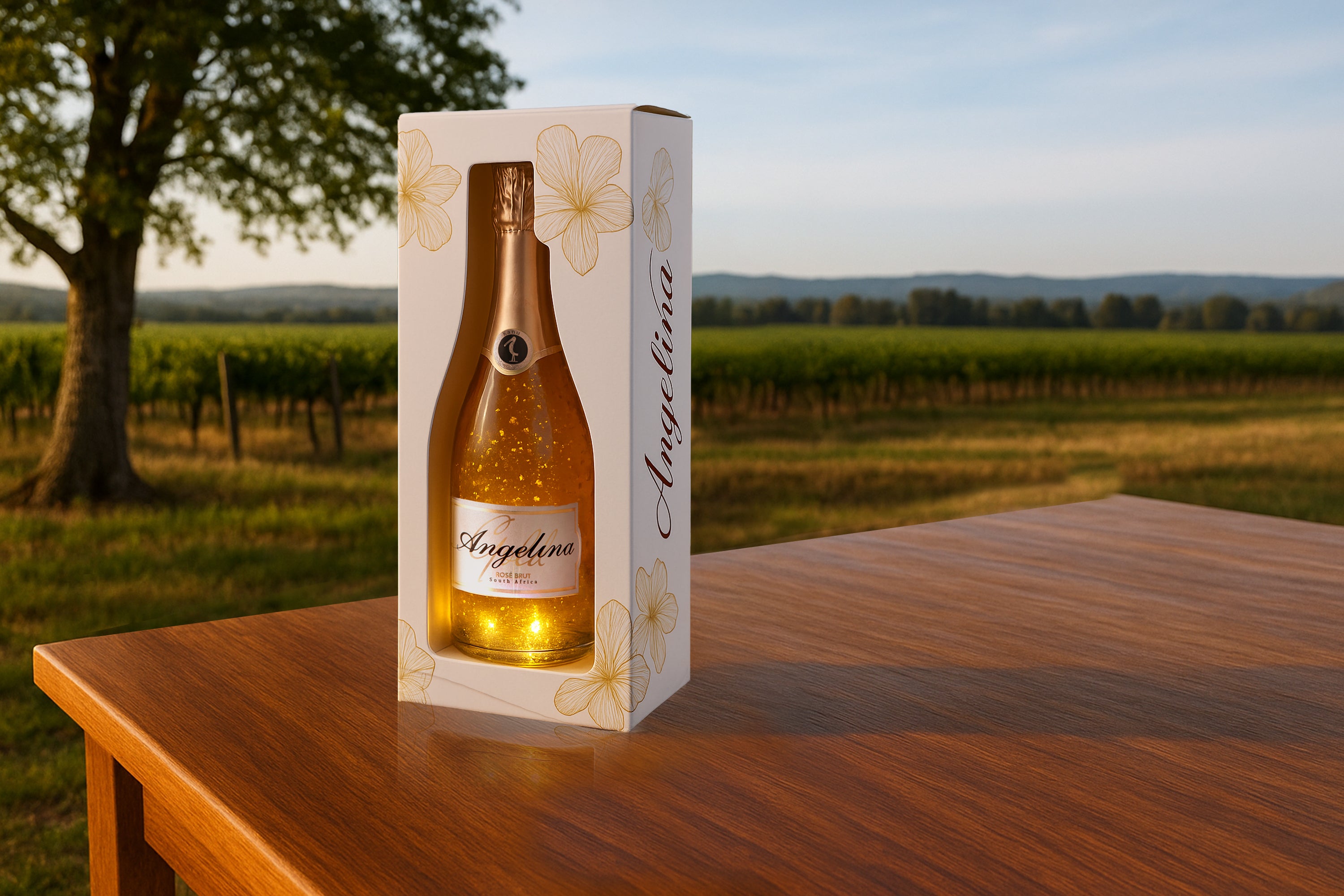 Angelina is a creamy, floral & fragrant bubbly. What makes it truly unique and exceptional is that it contains 24 carats of edible gold flakes - the first for sparkling wine in South Africa.